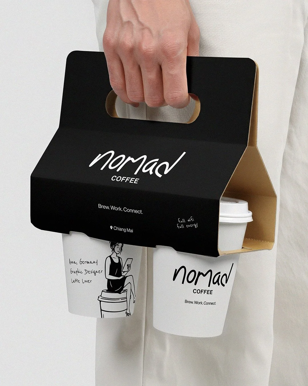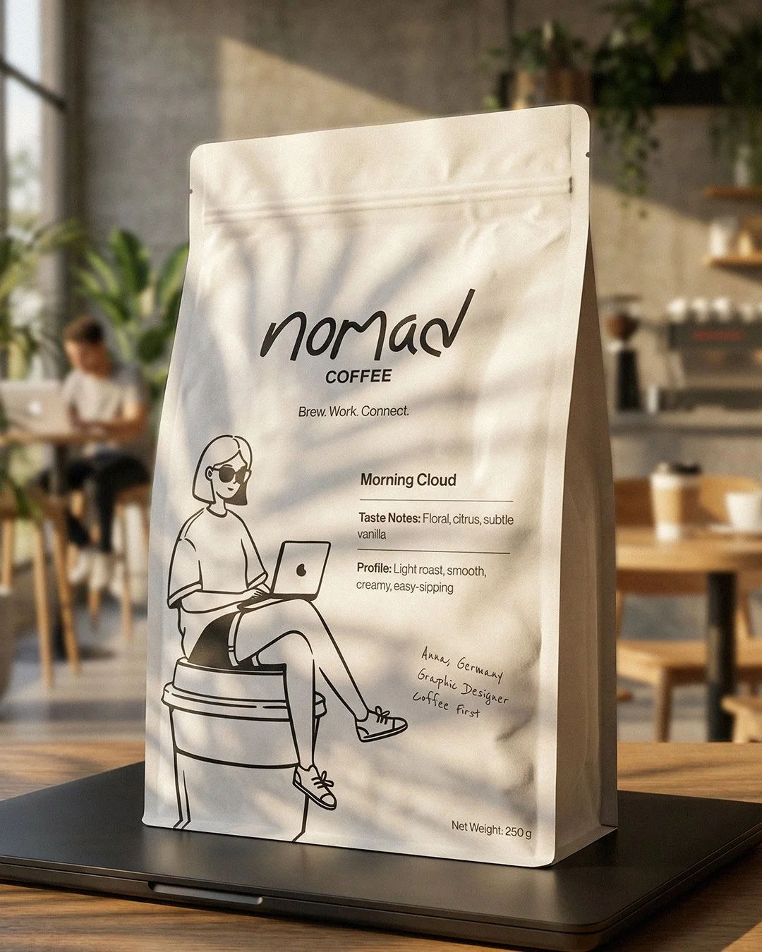 A concept coffee shop for remote workers, designed to reflect the digital nomad lifestyle: fast WiFi, good coffee, and cozy spaces for work and connection.